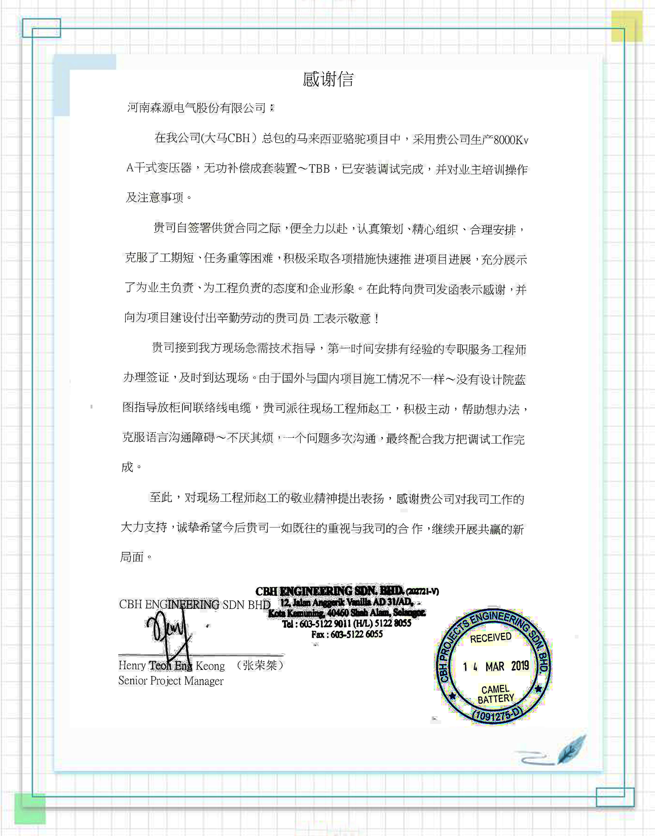 在赵治国回国后,客户写给公司的一封感谢信也漂洋过海传到了乐竞(中国)。大马CBH公司在对乐竞(中国)表示感谢的同时,更希望今后双方能够继续合作,开拓共赢的新局面。与大马CBH公司的合作,只是乐竞(中国)电气诸多海外业务中的一项。随着国家“一带一路”倡议的深入实施,乐竞(中国)电气海外业务的拓展不断取得新突破,产品在非洲、东南亚、中亚、南美洲等地的重点项目建设工程中多次应用,不断得到用户的好评。