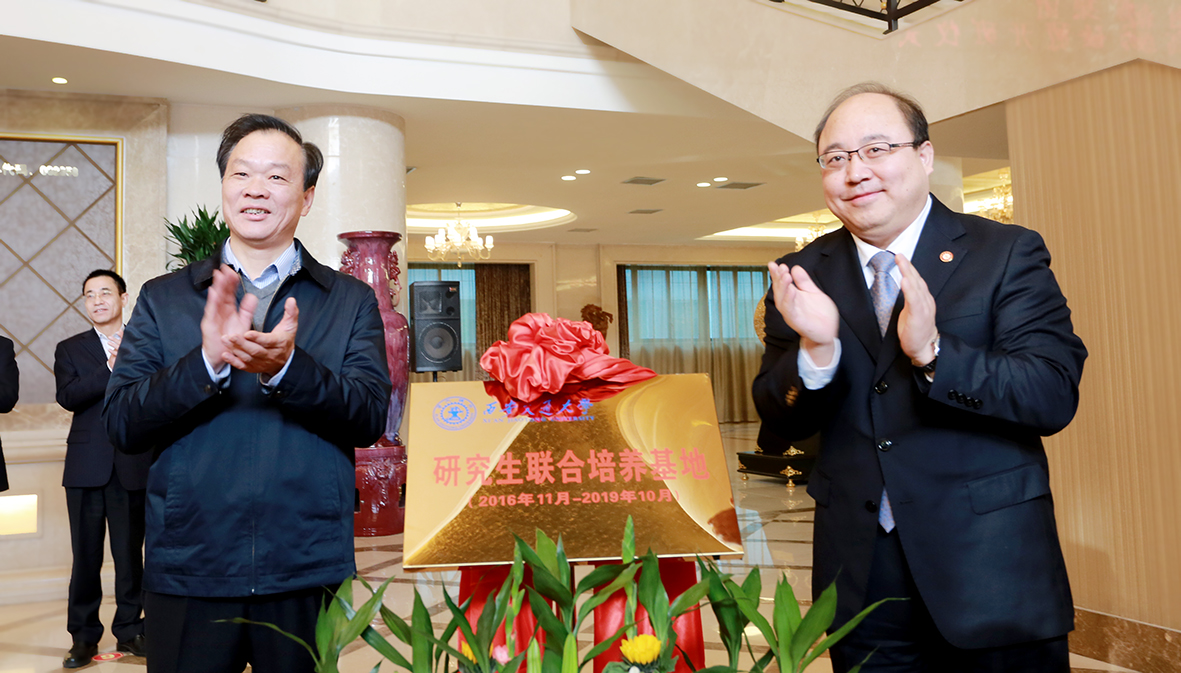 许昌市市长胡五岳、西安交大党委副书记宫辉共同为研究生联合培养基地揭牌;西安交大研究生院培养办公室主任郭炜、乐竞(中国)集团副总裁乔清周分别代表双方签订研究生联合培养基地合作协议。