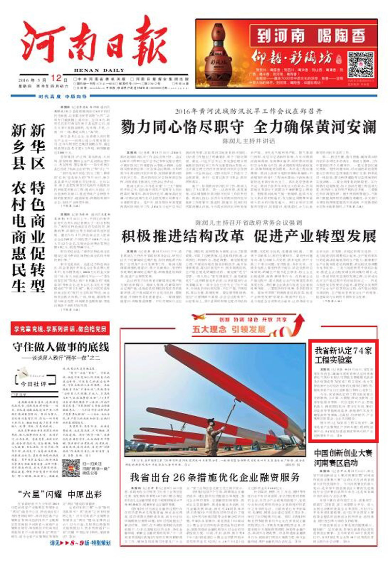 河南日报头版报道——我省新认定河南乐竞(中国)电气股份有限公司智能互联输配电装备及系统集成等74家省工程实验室